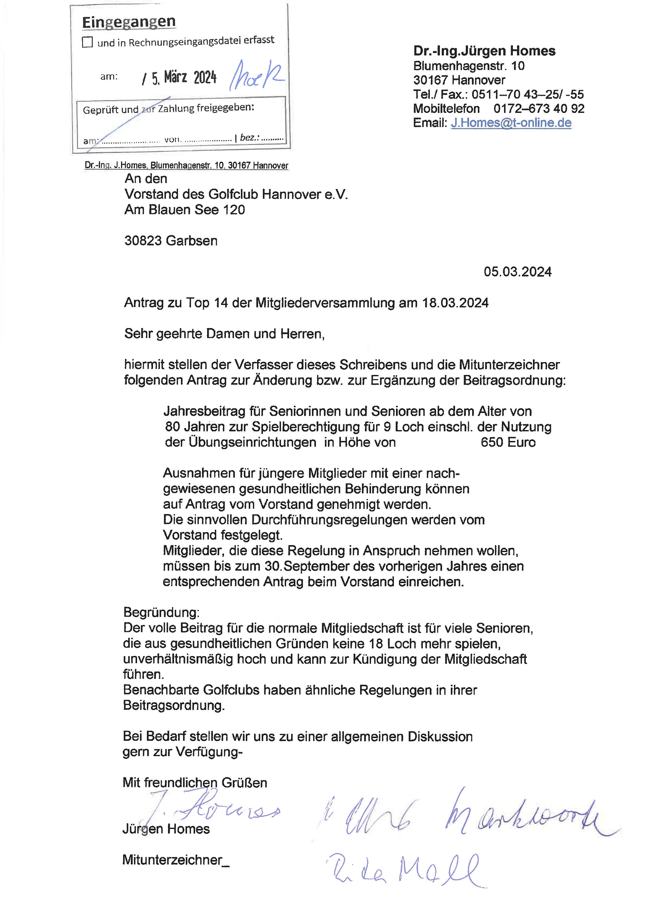Weiterhin übersenden wir Ihnen einen Antrag von unserem Mitglied Herrn Dr. Jürgen Homes zu TOP 14, den er termingerecht eingereicht hat. Der Antrag ist dieser E-Mail beigefügt und steht auch als PDF im -Member’s Only Bereich- zur Verfügung.