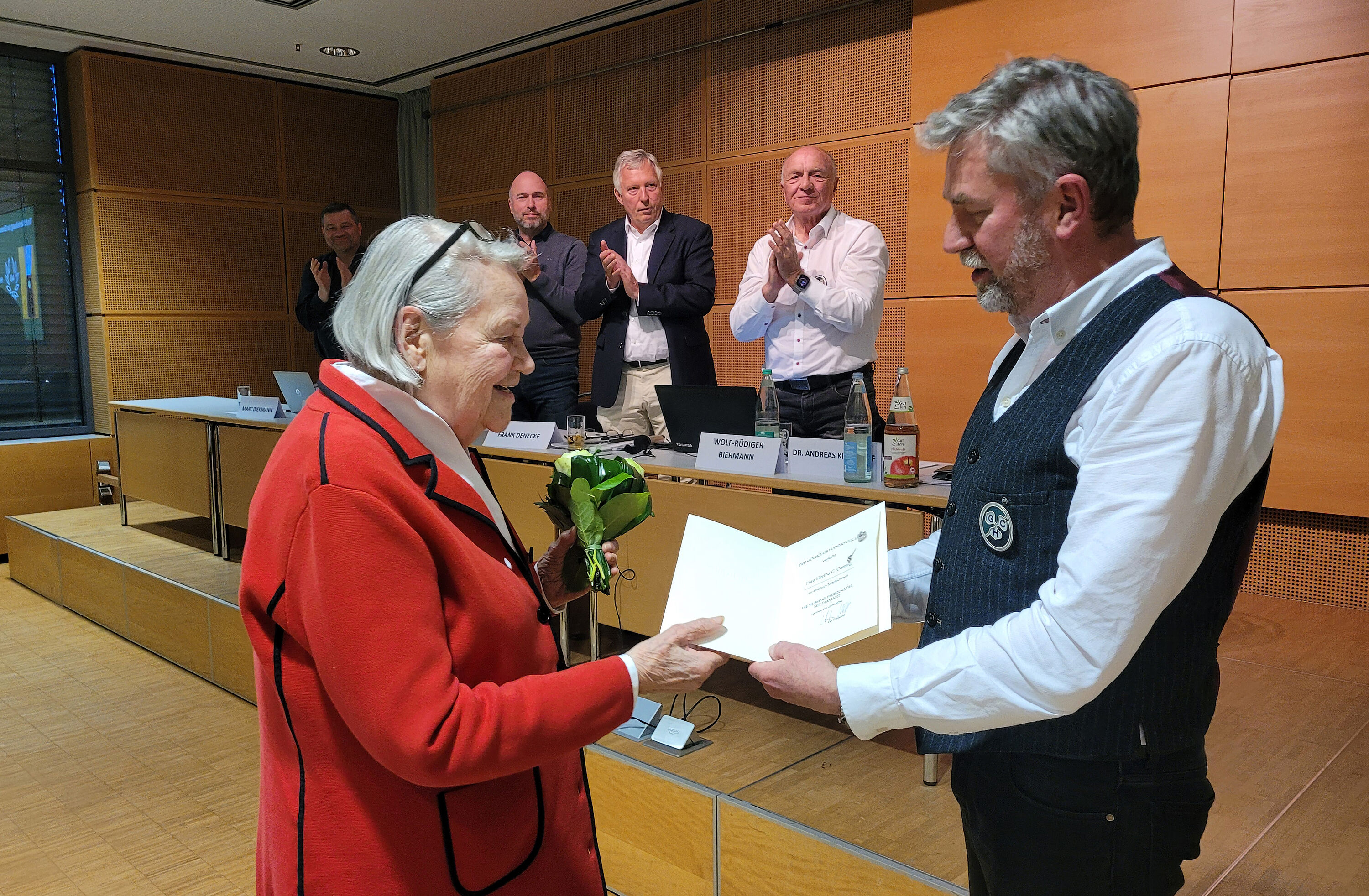 Standing Ovation gab es bei den finalen Ehrungen an diesem Abend: Persönliche Glückwünsche konnte Hertha C. Oetting entgegennehmen, die den GC Hannover seit 40 Jahren ihre golferische Heimat nennt. Das Ehepaar Struckmeyer zählt sogar stolze 50 Mitgliedsjahre, erhielt die Auszeichnung aber schon im Rahmen des Neujahrsempfangs.