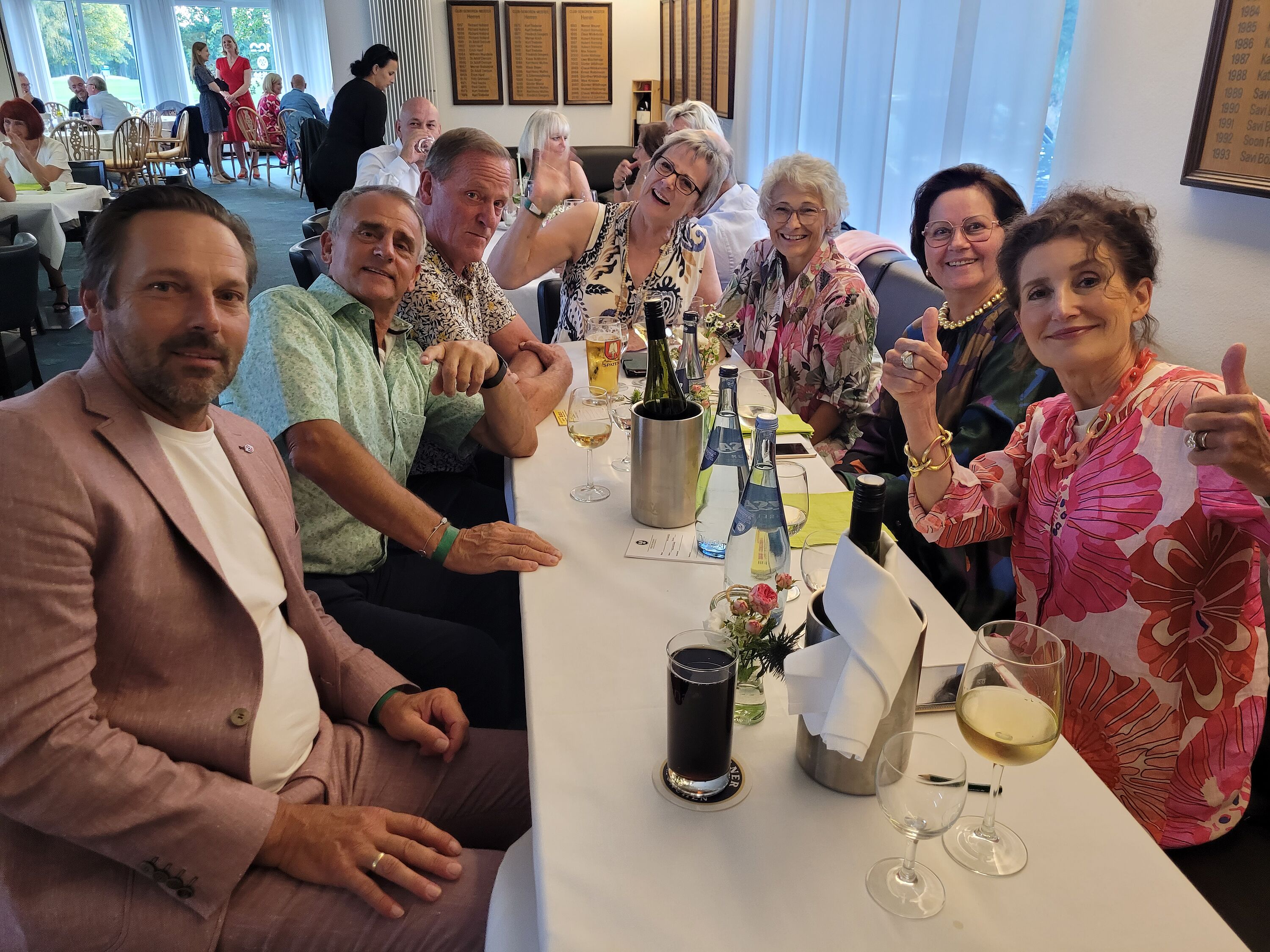 Bereits am Nachmittag war ein 9-Loch-Turnier für die Gäste organisiert, dessen Siegerehrung in den Ablauf des Abends inkludiert und von Axel Heck (PCCaddieOnline) moderiert wurde. Um 18:45 Uhr eröffnete unser Präsident Michael P. Wermelt mit den Worten „Einen wunderschönen guten Abend, wir sind Hundert...“ den Abend. Acht Grußworte und Reden waren auf dem Ablaufplan des Abends eingeplant, dazu ein Dreigang-Menü. Erfreulicherweise waren die Grußworte in den Menüablauf eingearbeitet und die Sorge: „Erst die Reden dann das Essen“ war unbegründet. Die Begrüßung des Präsidenten war erfolgt und leichte Unruhe machte sich unter den 120 Anwesenden breit. Würden nun 100 Jahre Geschichte folgen? Nein, ein kurzer Verweis auf den Podcast „Die Waldplatzreife“ und den Hinweis, dass man hier viel über die Geschichte des Clubs erfährt, unter anderem auch Dinge die bisher unbekannt waren und dann gehörte der Abend den RednerInnen. Charmant und eloquent moderierte unser Präsident durch den Abend. Die Küche begleitete in drei Gängen mit Vorspeise (Tomatensuppe)- Hauptgericht (Tafelspitz) und Dessert (Mousse au Chocolat oder Früchte) die Ansprachen. Noch vor der Vorspeise sprach der Garbsener Bürgermeisters Claudio Provencano seine Grußworte. Interessant kommentierte er den Eintrag des GC Hannover e.V. in das Vereinsregister Hannover und die räumliche Zugehörigkeit des Clubs zur Stadt Garbsen. Zu gern hätte er doch dem „Golfclub Garbsen“ zum 100. Geburtstag gratuliert. Es sind Dinge, die gelegentlich zu interessanten Verwirrungen führen können, z.B. bei der Wahl des Sportlers/der Sportlerin des Jahres, welche jedes Jahr aufs Neue zu Irritationen führt. Aus Sicht der Stadt Hannover können wir nicht mitmachen, weil wir räumlich zu Garbsen gehören und aus Sicht der Stadt Garbsen dürfen wir nicht mitmachen, weil wir im Vereinsregister Hannover geführt werden. Die ersten Lacher hatte er in seiner kurzweiligen Rede auf seiner Seite. Die hannoversche Bürgermeisterin Frau Monica Plate, in Vertretung von Herrn Onay, konterte als bekennende Nicht-Golferin charmant und dann gab es auch schon die Vorspeise, um den ersten Hunger zu stillen.